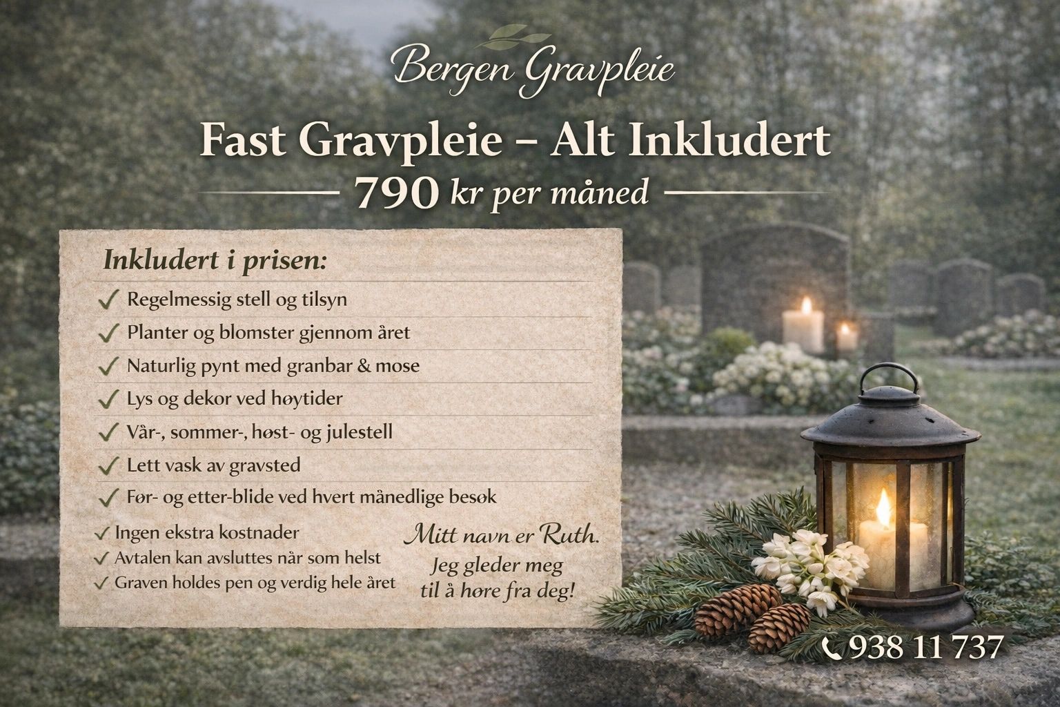Bergen Gravpleie er en omsorgsfull tjeneste der jeg steller og pynter gravsteder i Bergen med respekt, verdighet og et varmt hjerte. Min oppgave er å sørge for at gravstedet alltid fremstår rent, vakkert og godt ivaretatt –